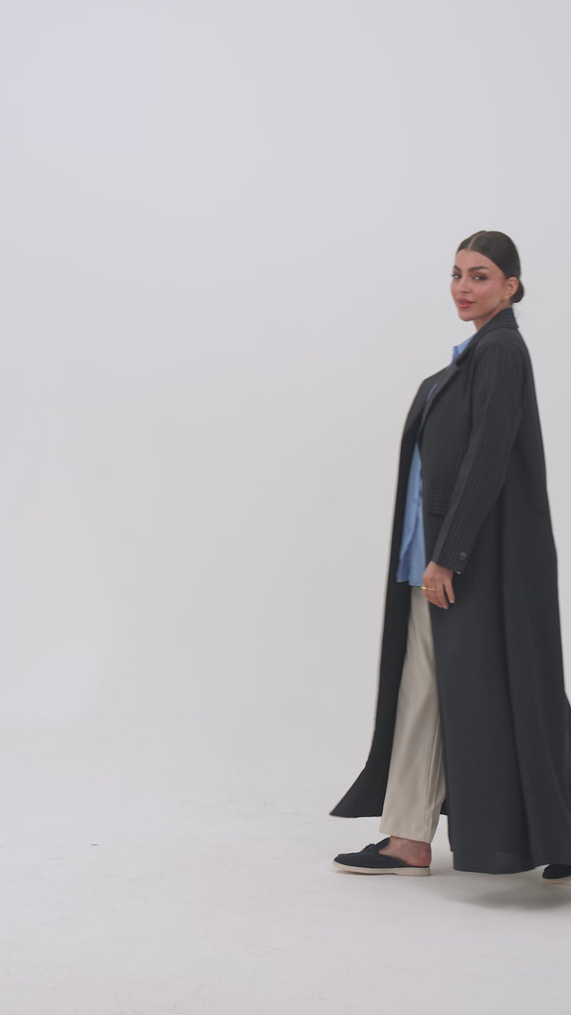 هالعباية من قماش كريب فاخر، ناعم وخفيف بس ثابت. تصميمها بليزر مفتوح مع ياقة عريضة وبطانات خفيفة على الأكتاف تعطي لمسة راقية. فيها جيوب وهمية وجيب داخلي عملي. الأكمام مستقيمة ومزودة بأزرار تكمل اللوك بشكل مرتب. لونها كحلي غامق مع خطوط بيضا رفيعة تعطي لمسة كلاسيكية وأنيقة.
