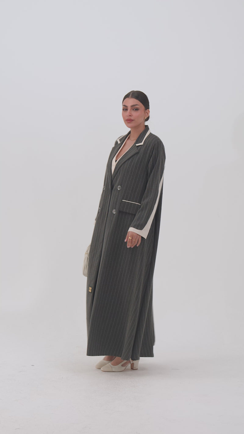 This elegant blazer-style abaya is crafted from premium crepe fabric for the perfect mix of structure and flow. The blazer-style abaya features a double-breasted cut with sharp lapels, light shoulder pads, and a refined shape. Fine white pinstripes give this blazer-style abaya a timeless, classic vibe, while the off-white inner cuffs add a fresh, modern twist. Practical details like faux pockets, a hidden inner pocket, and a small arm slit make this blazer-style abaya both functional and stylish. The full-length hem of the blazer-style abaya blends the tailored look of a blazer with the soft elegance of an abaya—perfect for any occasion. With its sleek design, the blazer-style abaya offers effortless sophistication.