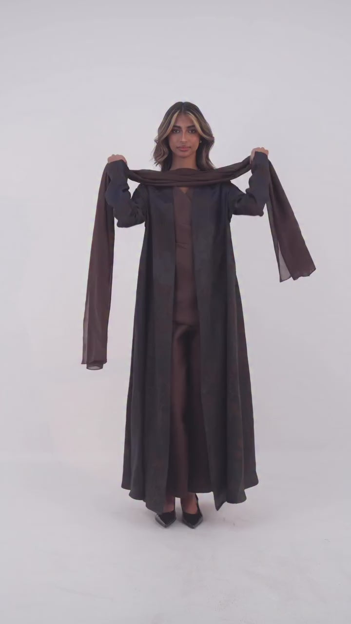 عباية من حرير الجاكارد بلون كحلي غامق ونقشة بني ناعمة. خامتها فيها لمعة خفيفة ولمسة فخمة و شكل أنيق. تصميم مفتوح من الأمام مع أكمام واسعة تعطيك لوك كلاسيكي وراقي يناسب كل الأوقات.